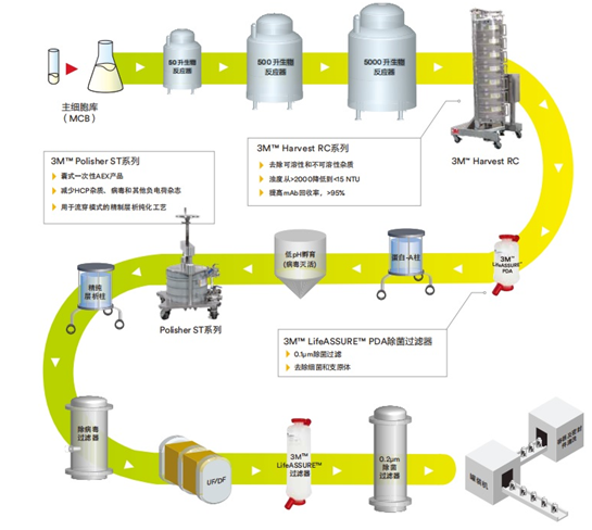 从实验室到规模化生产,3M Harvest RC层析式澄清囊式产品能够稳定地为高密度细胞收获液提供>95%的mAb产品回收率。