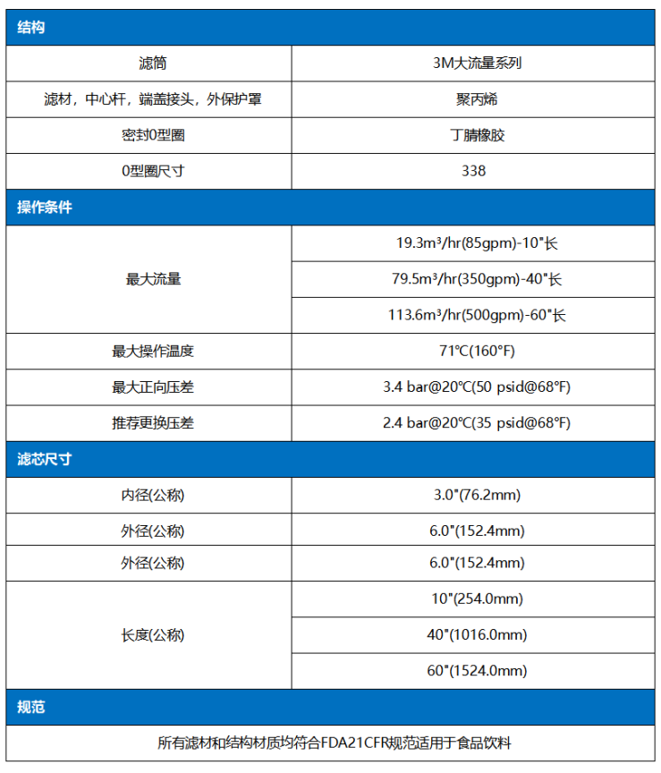 TMHFM大流量滤芯采用3M水平打褶设计,增加了滤芯的有效过滤面积,具有流量大,效率高的特点。外进内出的流动方向设计,满足大流量过滤的需求,适用于大流量滤筒系列。