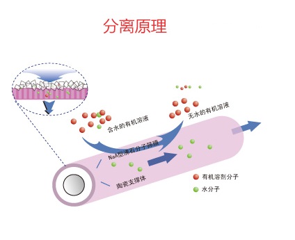 采用蒸汽渗透膜分离技术进行有机溶剂脱水,可代替蒸馏、萃取、吸附等传统分离方法,能够以低能耗获得高质量的产品,实现常规方法很难或无法实现的分离要求,在有机物或混合有机物中少量或微量水分的脱除上具有更明显的优势。