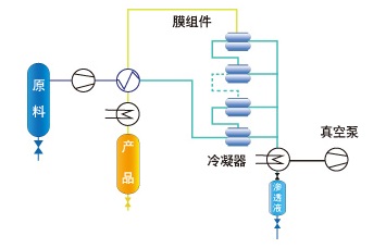 蒸汽渗透技术的核心是借助蒸汽渗透膜的选择透过性使有机溶剂中少量或微量的水透过分离膜,而绝大多数的物料保留在膜的另一侧。该分离过程表现出高度的节能效果,特别适合共沸物、近沸混合物的分离,与传统的精馏、吸附技术相比可节能50%以上,收率>99%。