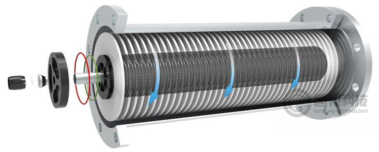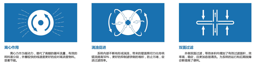 离心过滤是一种新型的错流过滤技术,通过让离心碟片动态运行起来,能够减轻过滤面污染。从结构上讲,它是由通过一根可旋转的中空轴,带动固定于轴上的碟片转动。碟片随着马达带动的轴一起高速旋转,利用旋转运动产生的离心力、水力剪切力、以及滤液的强烈湍流,可以高效清除过滤面滤层,过滤速度衰减缓慢并且受料液浓度的影响较小,连续稳定过滤时间长;同时减少盐结晶、结垢、凝胶层和有机物等污染,极大延长碟片的化学清洗周期;并且系统不需要高流量高压力,大大节约了能耗,用电量是传统过滤技术的三分之一。