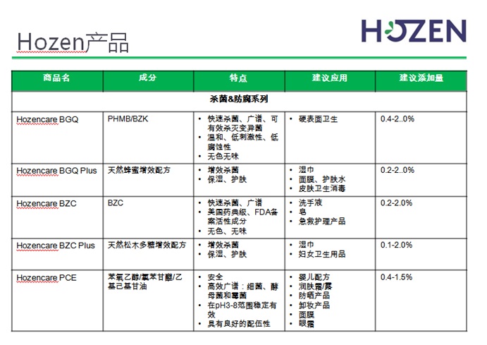 HOZEN可为日化行业,如:个人护理湿巾、婴儿湿巾、厨房湿巾、面膜、洗面奶、洁面乳、洗手液、护手霜、眼霜、彩妆、乳液、洗发水、染发素、护发精华素、保湿水、保湿霜、保湿乳、爽肤水、洗衣液、洗衣皂、防晒霜、美白霜、怯斑霜等化妆品、洗涤护理用品提供完整的微生物控制解决方案。产品类型包括复合型、温和型、低刺激型、低敏感型、广谱型、高效型、快速型等全功能产品。