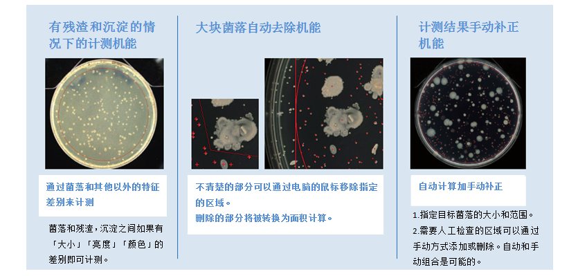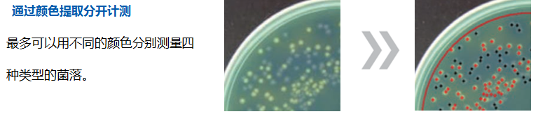 原理:在自动测量时,可以从测量对象中自动排除大的菌落。可测量的区域可自动计算,并可实现精确的CFU转换。