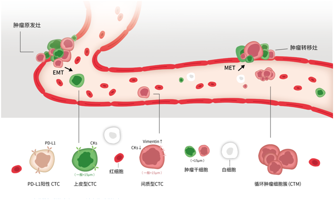 肿瘤细胞从肿瘤组织中脱落,在进入外周血循环的过程中发生上皮-间质转变(Epithelial Mesenchymal Transition,EMT),并克服自身及血液循环中各种因素的杀伤作用,到最后定植形成新的转移灶等多个生理步骤,使得