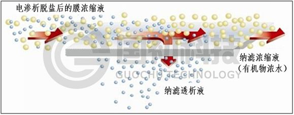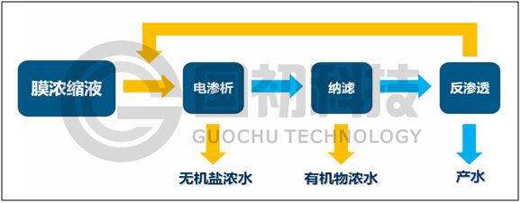 国初科技一体化垃圾渗滤液电渗析深度处理系统是基于对膜浓缩液进行减量化及资源化处理的主体思路,核心技术要点是通过电渗析工艺实现无机盐与有机物的分离。具体工艺路线采用“电渗析+纳滤+反渗透”为核心的全膜法处理工艺,工艺流程如图: