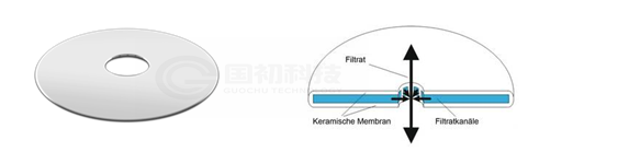 起分离作用的核心元件,外观为圆盘碟片形,碟片包括分离的两面膜层,内部设有导流槽,中间周围设有若干出液孔,过滤时料液从外侧向内侧过滤。碟片材质为无机材料,支撑体孔径2um,膜的过滤精度涵盖微滤和超滤,具体有2µm、0.5 µm、0.2 µm、60 nm、30 nm、7 nm、5 nm几种规格。该碟片具有极强的化学耐受性和耐热性,可反向冲洗 。