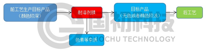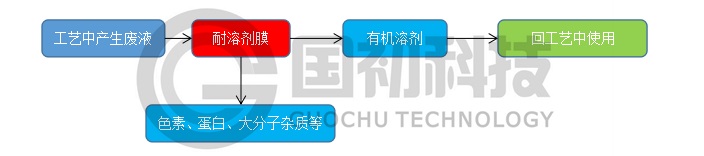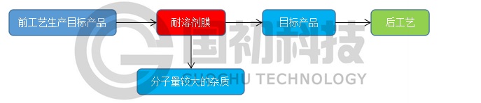 有机溶剂在不高于60bar作用压力下穿过耐溶剂膜成为渗透液,然后分子量比膜大的物质被膜阻挡下来成为浓缩液。可以有一种或者多种溶质通过膜进入渗透物中,而其他的则保留在残余物中。目前特种耐有机溶剂体系膜的截留分子量可以有150D、200D、300D、500D、900D、20KD等供选择,国初科技目前正在研发更多分子量的特种分离膜。