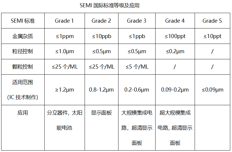 超净高纯化学品是微电子技术发展过程中不可缺少的关键基础化工材料,主要应用在半导体、平板显示、太阳能光伏领域等及微电子、光电子器件制造领域。随着微电子技术的迅猛发展,对超净高纯试剂的要求和标准也不断在提高。超净高纯化学品的纯度和洁净度对集成电路的成品率、电性能及可靠性均有十分重要的影响。不同线宽的集成电路(IC)制作工艺技术,对超净高纯化学品中金属杂质、颗粒物有严格要求。金属杂质如Au、Pt、Fe、Ni、Cu等,以及碱金属Na、K等,都会对电子元器件的性能产生严重影响。因此,在制备超净高纯化学品时,除金属杂质和颗粒是至关重要的环节,如下表所示: