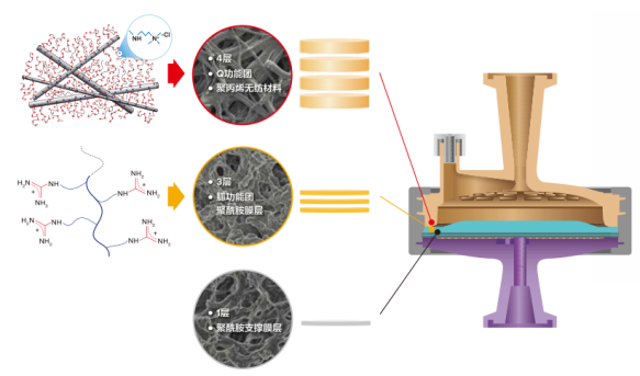 对于细胞收获液的精制过滤,可采用一次性膜层析技术。一次性膜层析材料由三部分构成:Q-功能团无纺材料、胍功能团膜层,支撑膜层。Q-功能团部分由4层聚丙烯无纺材料组成,表面共价结合了季胺功能团聚合物;胍功能团部分由3层聚酰胺微孔膜组成,公称精度为0.8μm,共价结合胍功能团;支撑膜层为公称精度为0.8μm的单层聚酰胺膜。