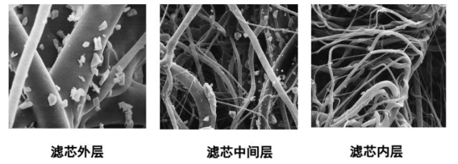 采用滤芯过滤方式纯化细胞裂解液,是一种高效且安全的分离技术。深层过滤的滤芯组分包含助滤剂、纤维素和树脂,其孔径结构逐渐致密,杂质固体颗粒在不同深度被拦截,可有效延长滤芯的使用寿命。深层滤芯内部结构图:
