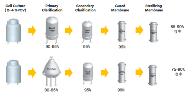 传统的离心及深层滤芯澄清工艺,由于工艺步骤繁多,影响产品收率。一般收率在75-90%。