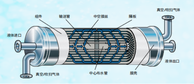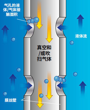 膜丝内部(管程)采用真空模式或吹扫气体时液体在中空膜丝外部(壳程)周围流动。采用真空模式或吹扫气体,可产生气体浓度差,以便使气体以极佳的精度进入液体或从液体中排出。