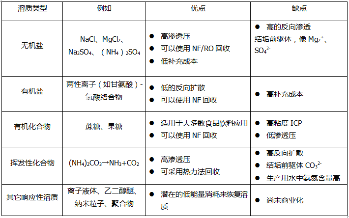针对不同的渗透压,汲取液再生过程可以辅以不同的技术, 包括反渗透,膜蒸馏,电渗析等等。