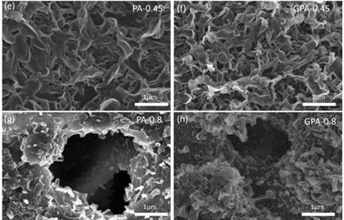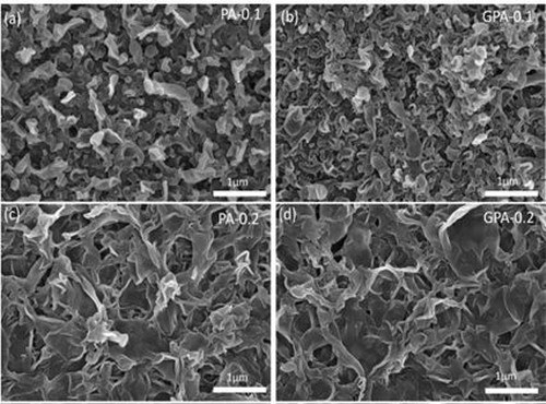 图6可以看出PA膜和引入中间层的PA膜均为经典的脊谷聚酰胺膜,表面粗糙,含有结节和“叶状”褶皱。随着载体孔径的增大,聚酰胺的结构由相对较小的虫状结构向“叶状”结构转变。尼龙载体孔隙大小从0.1到0.45μm发现覆盖与聚酰胺层PA和引入中间层的PA膜没有明显差异。然而,当尼龙载体的孔隙大小增加到0.8μm,引入中间层的PA膜显示了更好的覆盖层与不可见的微米大小的孔,这进一步证明了中间层的存在促进了聚酰胺层生长在大毛孔,生成无缺陷聚酰胺层。