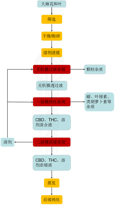 膜分离技术应用于工业大麻处理的工艺流程: