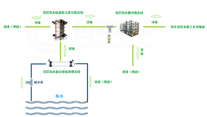 为更好满足深层海水的多元化利用。国初科技(厦门)有限公司采用新型膜分离技术,将深层海水中氯化钠脱除,保留除了一价离子以外的所有矿物质及微量元素,同时考虑矿化度(钙镁等微量元素)的调整,得到不同矿化度(钙镁等微量元素)的产品,满足多样化的产品需求。工艺路线如下: