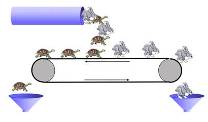 色譜分離技術是基于不同物質在由固定相和流動相構成的體系中具有不同的分配系數,在采用流動相洗脫過程中呈現不同保留時間,從而實現分離。傳統色譜分離技術采用固定的色譜塔進行,先進入一定量物料,然后采用洗脫劑不斷洗脫,在同一出口在不同時間段就可接到不同的產品組分,此過程費時費力。經過分析并加以改進,我們把固定相的樹脂做成可以連續流動的系統,利用物質與固定相的相對運動速度不同實現分離。類似龜兔賽跑的原理,我們把固定相必成一個傳送帶,把兔子烏龜分別比成快慢不同的兩組份,只要使固定相加上一個與洗脫方向相反的驅動力,使傳送帶運動速度處于兔子和烏龜速度中間,跑得快的兔子比固定相快從前頭得到,跑得慢的烏龜被傳送帶帶到后面得到。