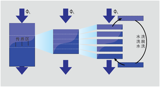 離子交換技術是基于樹脂功能基團與物料中特定離子的吸附作用進行的交換過程,離子交換是可逆的等當量交換反應。傳統的離子交換應用時采用固定床實現的,我們對固定床的工作過程進行分析發現,在交換過程中樹脂床將分為三段,即飽和區、活性區(傳質區)和新鮮樹脂區。隨著交換進行,傳質區不斷下移直至底部交換完全。整個過程只有傳質區處于工作狀態,飽和區和新鮮樹脂區閑置,因此樹脂利用率低。為了提高樹脂利用率,我們把傳質區進行抽象分割成幾個小單元,一旦上面的小單元飽和后就移出來進行洗水及再生操作,處理用的新鮮樹脂單元又回到傳質區底部循環使用,這樣大大提高樹脂的利用率。