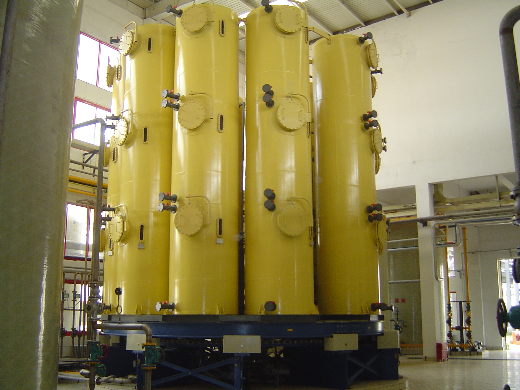 連續移動床設備由一個帶有多個樹脂柱(16,20,30柱)的圓盤,和一個多孔分配閥組成。通過圓盤的轉動和閥口的轉換,使分離柱在一個工藝循環中完成了吸附,水洗,解吸,再生的全部工藝過程。且在連續離交系統中,離子分離的所有工藝步驟在同時進行。相比而言,固定床離子分離系統是在一種間歇式的工藝中一步一段時間的進行所有步驟的操作。