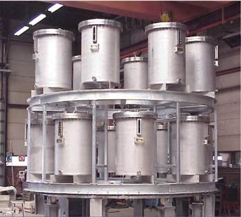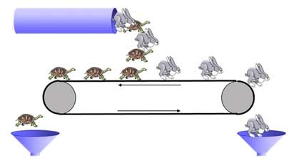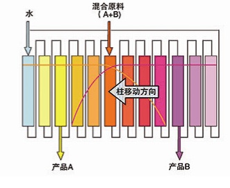 連續色譜分離設備是基于不同物質在由固定相和流動相構成的體系中具有不同的分配系數,在采用流動相洗脫過程中呈現不同保留時間,從而實現分離。傳統色譜分離技術采用固定的色譜塔進行,先進入一定量物料,然后采用洗脫劑不斷洗脫,在同一出口在不同時間段就可接到不同的產品組分,此過程費時費力。經過分析并加以改進,我們把固定相的樹脂做成可以連續流動的系統,利用物質與固定相的相對運動速度不同實現分離。類似龜兔賽跑的原理,我們把固定相必成一個傳送帶,把兔子烏龜分別比成快慢不同的兩組份,只要使固定相加上一個與洗脫方向相反的驅動力,使傳送帶運動速度處于兔子和烏龜速度中間,跑得快的兔子比固定相快從前頭得到,跑得慢的烏龜被傳送帶帶到后面得到。