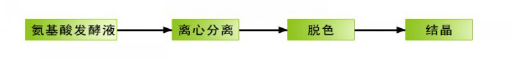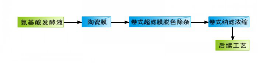 氨基酸是組成蛋白質的基本單位,多數氨基酸都采用發酵法生產。發酵液是極其復雜的多項體系,含有微生物細胞、代謝產物、未耗用的培養基等。傳統的工藝路線中用離心法和板框過濾,濾液質量差,可溶性蛋白、糖類、多肽、色素等雜質均不能被有效去除,增加后續工藝的處理負荷,影響提取工藝的整體收率,也影響了最終的產品質量;而傳統的固定床樹脂工藝,樹脂用量大,酸堿水消耗高,成本高,環保壓力大。工藝流程如下圖所示: