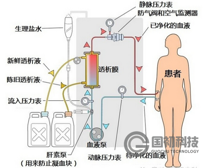 在血液透析治療過程中,主要依據彌散和超濾物理傳輸原理,把尿毒癥患者體內的水分排除。超濾主要是通過膜兩側的靜水壓來完成的,它不但可以清除部分有毒物質,還可以清除潴留的水分。人工腎膜要求血液適應性好,不會發生溶血現象,有害物質透過率高,而血小板和血球等不能透過,能用g射線或高壓蒸氣消毒等。其幾何形狀有中空纖維和平板膜兩種。組成透析器后,膜的總體性能用清除率或透析率來衡量。