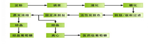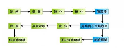 葡萄糖也稱右旋糖,是人類不可缺少的碳水化合物,是所需熱能的主要來源,是淀粉行業最主要的基本產品,也是醫藥、食品和相關產業的重要原輔料。葡萄糖是利用淀粉乳在一定條件下經酶催化水解而制得,在制備葡萄糖過程中,會有一部分的蛋白質、脂肪、纖維、色素、鹽分等雜質,直接影響葡萄糖的品質,傳統工藝流程如下圖所示:
